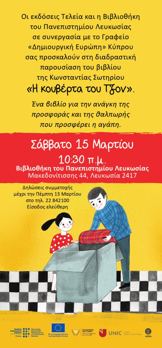 - Take part in the interactive presentation of the new children's book by Konstantia Sotiriou, John’s Blanket, published by Teleia Publications